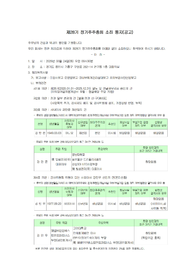 ※ 당사의 현금배당은 아래와 같이 결의되었습니다. 1) 배당기준일 : 2025년 12월 31일 2) 발행주식수 : 8,052,610주 3) 자기주식 : 41,986주 4) 배당대상주식수 : 8,010,624주 5) 배당금 및 시가배당률 : 1주당 70원 (시가배당율 1.3%) 6) 현금배당금 총액 : 560,743,680원※ 상기 시가배당율은 이사회결의일 제2매매거래전부터 과거1주일간(2025.12.03 부터 2025.12.09 까지) 종가를 산술평균한 가격으로 계산되었습니다. 따라서 배당기준일 기준 주가에 따라서 시가배당율은 변동될 수 있습니다.※ 배당금은 상법 제464조의2에 의거 정기주주총회일로부터 1개월 내에 지급할 예정이며 상기 지급예정일자는 변동될 수 있습니다.※ 상기내용은 외부감사인의 회계감사결과 및 주주총회 승인과정 등에서 변경될 수 있습니다.